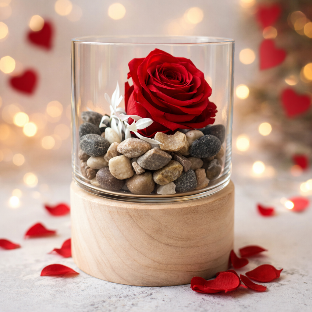 Présentée dans un contenant en verre clair de style scandinave avec un socle en bois naturel. Un cadeau simple et parfait pour exprimer votre amour à une personne spéciale pour vous!