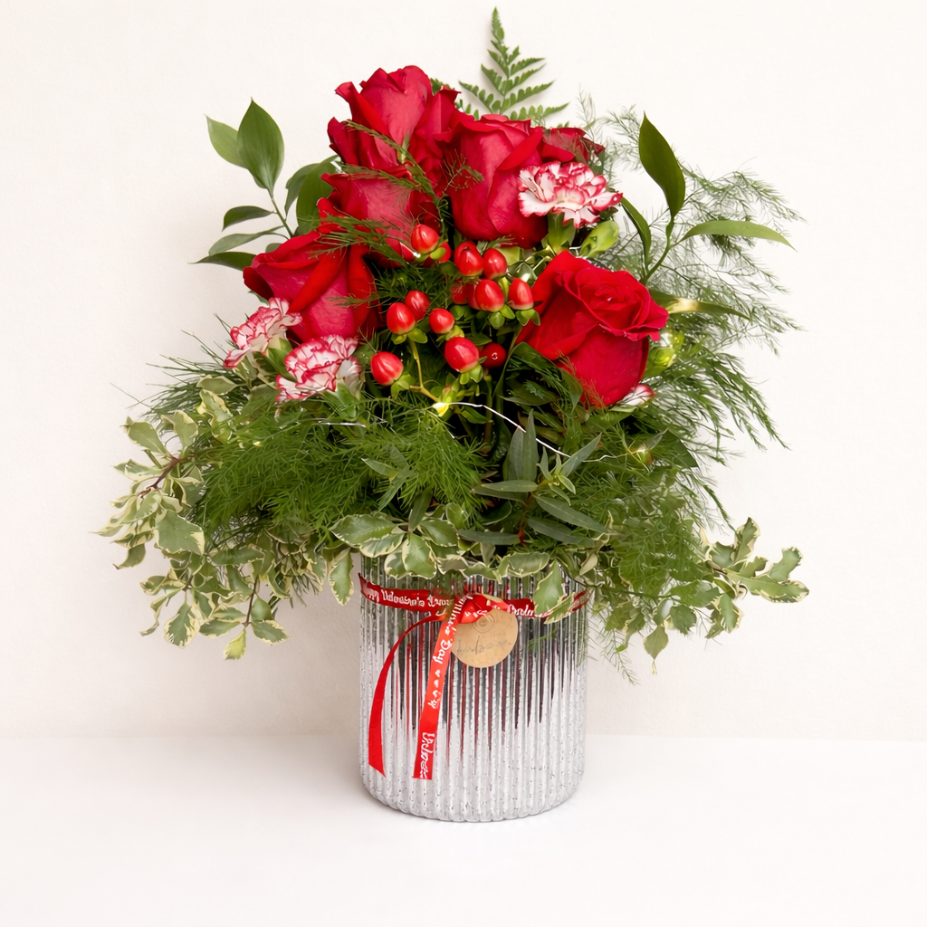 Offrez une attention romantique et raffinée avec cet arrangement floral lumineux, spécialement conçu pour célébrer l’amour. Composé de magnifiques roses rouges, de œillets délicats, de baies décoratives et d’un feuillage luxuriant, cet arrangement est présenté dans un vase argenté texturé au style moderne et élégant.