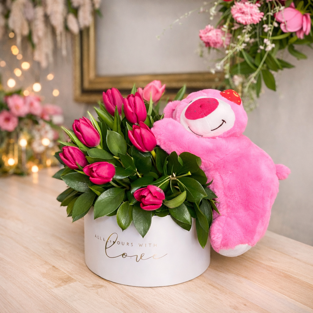 Ourson Fraise & Tulipes – Boîte Florale